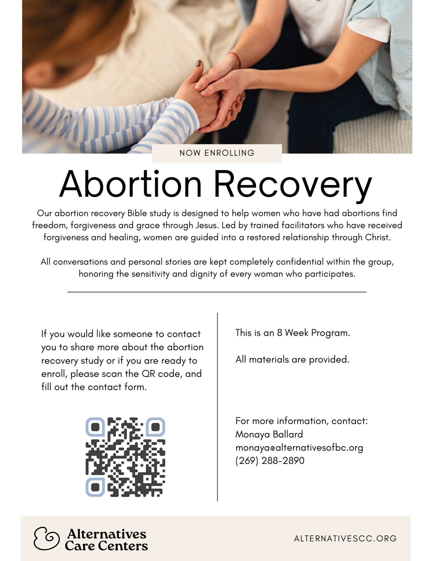 To enroll in an Abortion Recovery Bible study, please reach out to our Battle Creek Center Director, Monaya Ballard at monaya@alternativesofbc.org or at 269-288-2890.